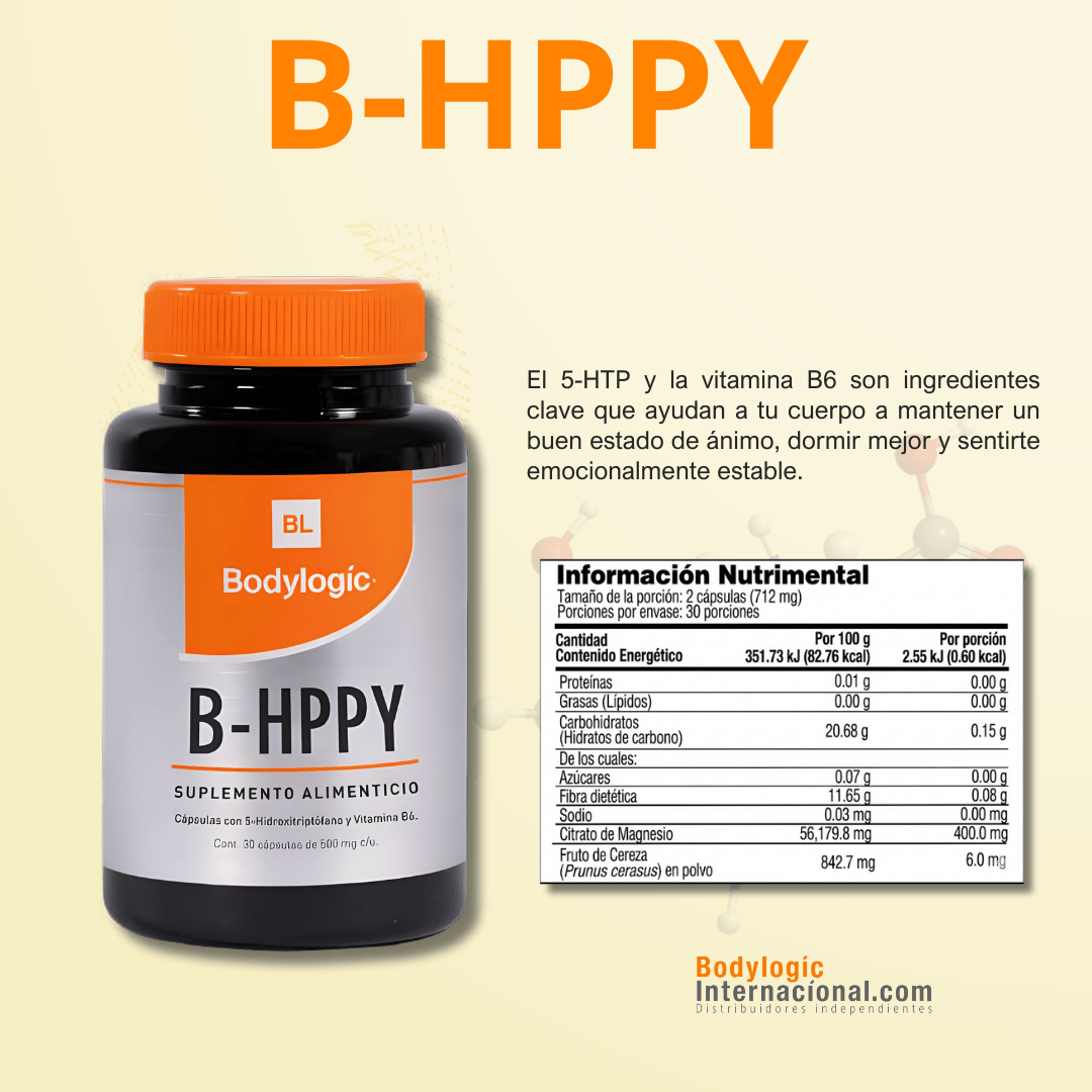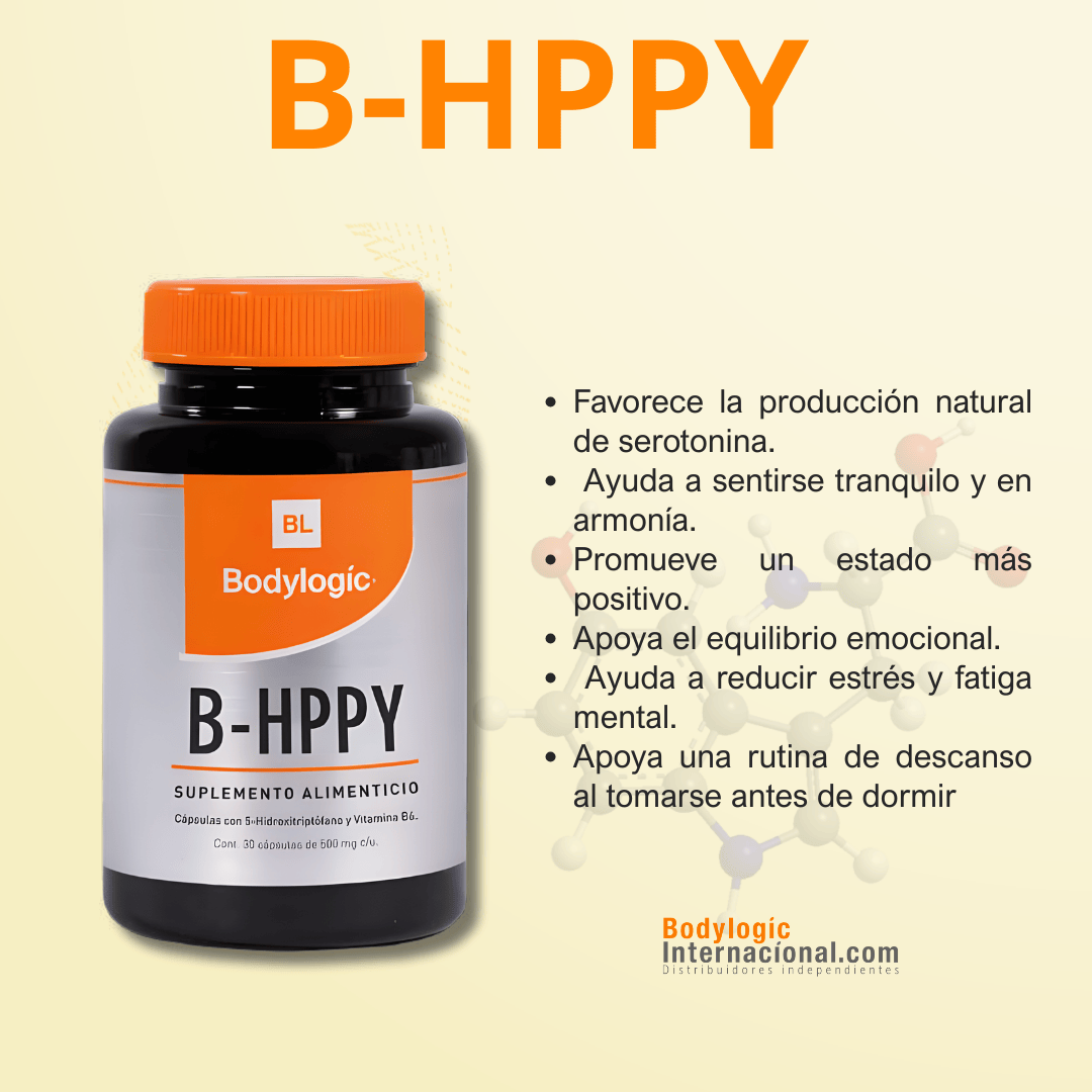 Su fórmula contiene 5-HTP (5-hidroxitriptófano) y vitamina B6, nutrientes relacionados con la producción natural de serotonina, neurotransmisor asociado al bienestar emocional. B-HPPY puede integrarse como parte de un estilo de vida enfocado en el equilibrio emocional y el autocuidado diario.
