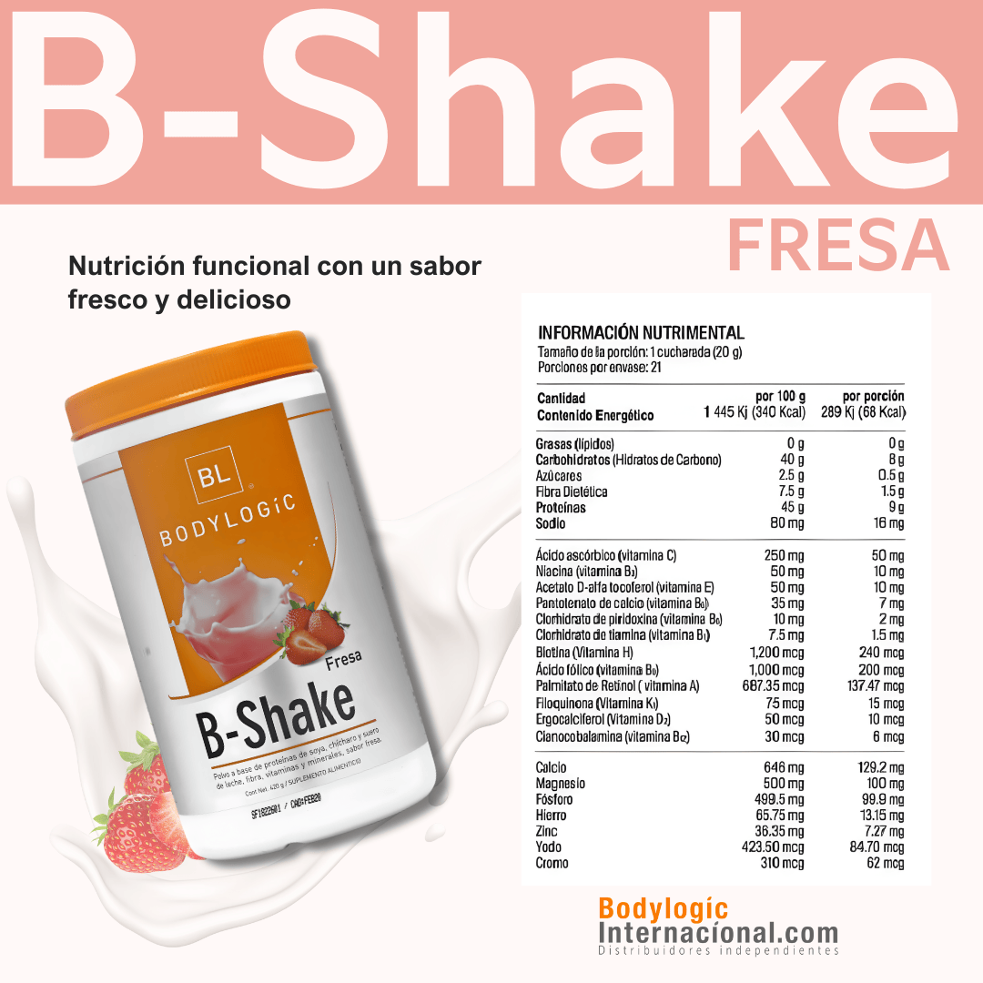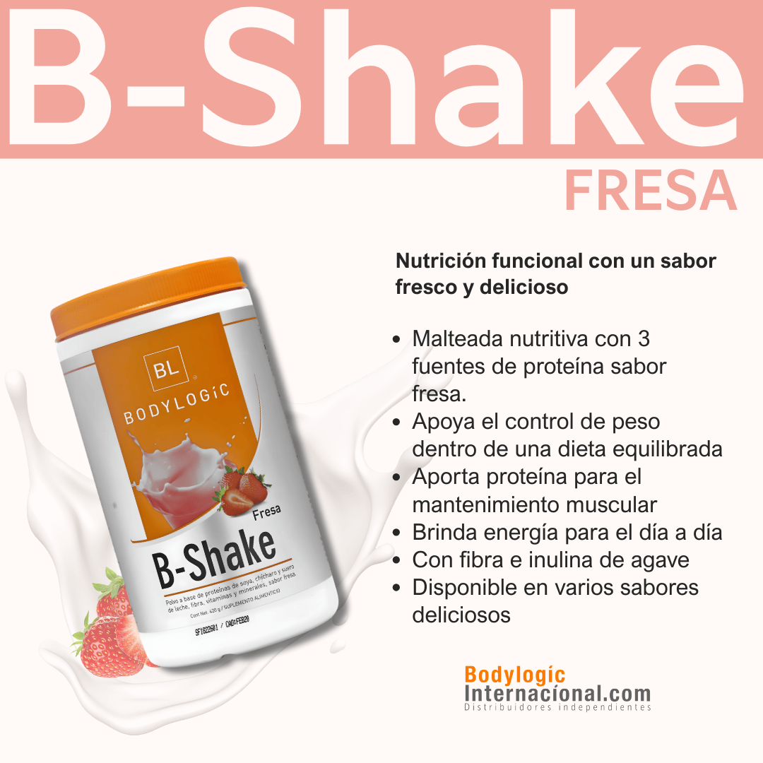 B-Shake es una malteada nutritiva que combina 3 proteínas de alto valor biológico: soya, chícharo y suero de leche. Aporta el balance ideal de proteínas, carbohidratos, fibra soluble e insoluble, además de estar adicionada con vitaminas, minerales e inulina de agave.